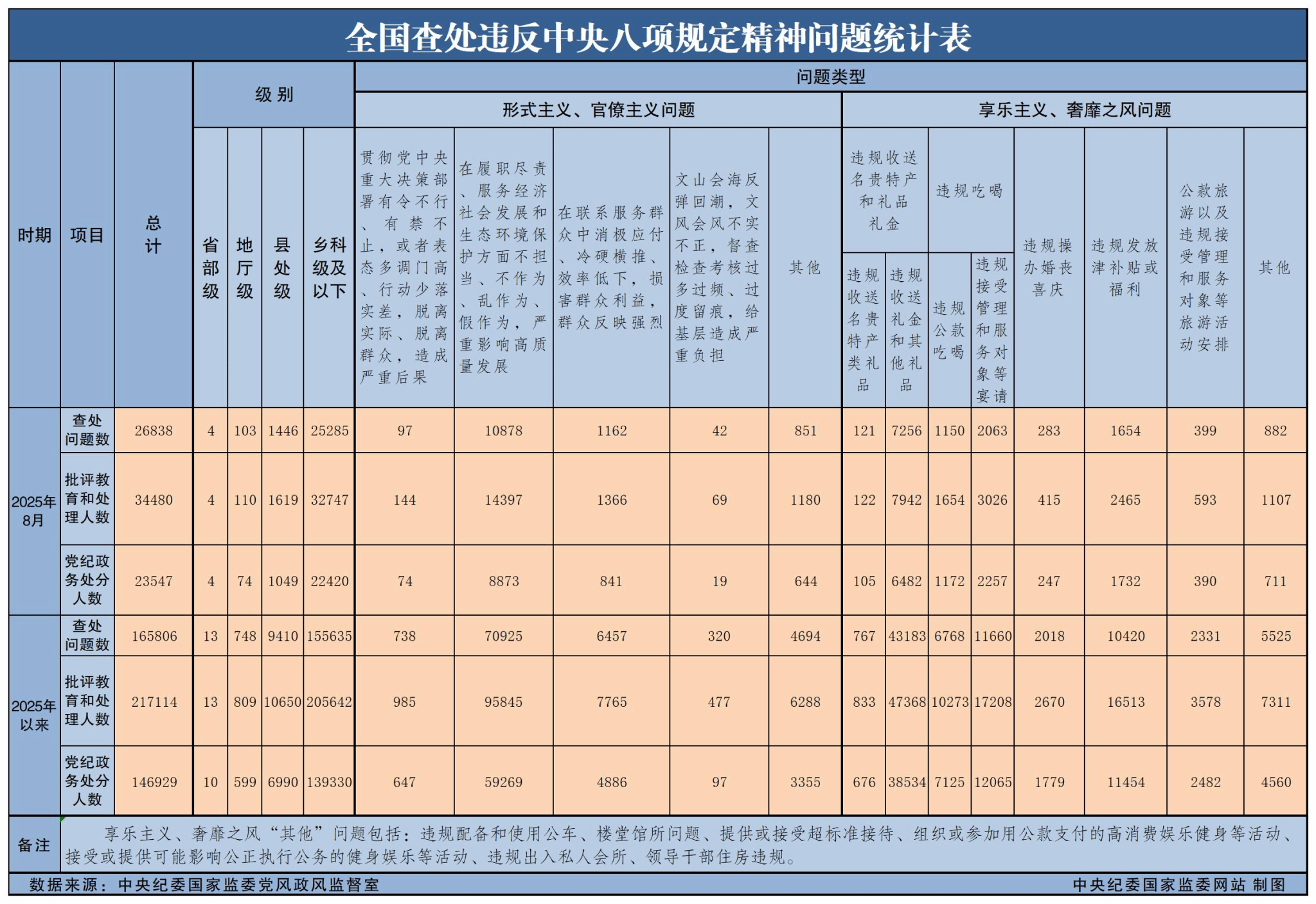 9月25日,中央纪委国家监委公布了2025年8月全国查处违反中央八项规定精神问题汇总情况。当月,全国共查处违反中央八项规定精神问题26838起,批评教育和处理34480人,其中党纪政务处分23547人,这是连续第144个月公布月报数据。